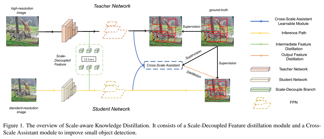 - Inference speed와 detection performance 간의 balance를 위해 본 논문에서는 ScaleKD를 제안함. 이는 multi-scale features를 decouple 하는 scale-decoupled feature distllation과 more informative knowledge를 위해 teacher의 bounding box noise를 refine 하는 cross-scale assistant를 포함함. COCO와 VisDrone에 대해서 성능개선 효과를 입증함.
