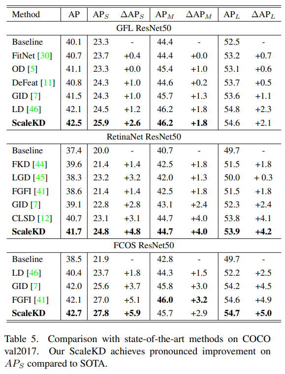 - VisDrone은 대부분 작은 물체로 이루어진 dataset이기 때문에 SOD에 대한 효과성을 검증하기에 타당하며, ScaleKD를 적용했을 때 성능이 향상됨을 확인할 수 있음.