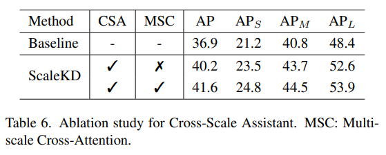 - Teacher에도 standard image resolution를 사용하여 CSA와 MSC의 효과성을 확인했음. 각 요소가 성능 개선에 도움이 된다는 것을 보임.