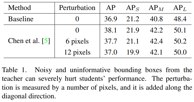- Noisy가 small object 성능에 미치는 영향을 확인하기 위해 Table 1의 실험을 진행했으며, 이를 통해 perturbation이 더해졌을 때 student의 small object에 대한 AP가 감소함을 확인할 수 있음.