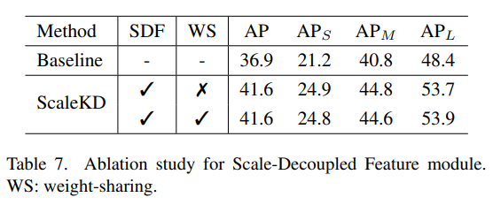 - Teacher에도 standard image resolution을 사용하여 SDF module에 대한 ablation study를 진행했음. SDF가 성능개선에 도움이 된다는 것을 확인했으며, separate weight가 큰 성능향상을 가져오지 못한다는 것을 통해 weight-sharing module이 momory cost를 save 하는 데 가치 있다는 것을 보임.