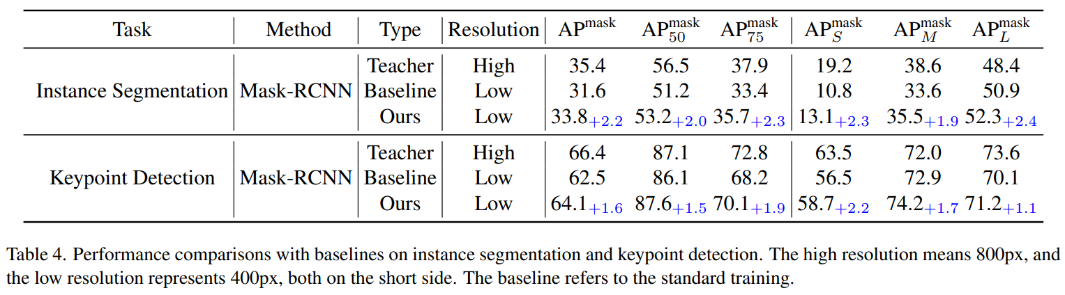 - ScaleKD를 적용하면, instance segmentation과 keypoint detection tasks에서 small input resolution에서도 baseline보다 높은 성능을 기록함.