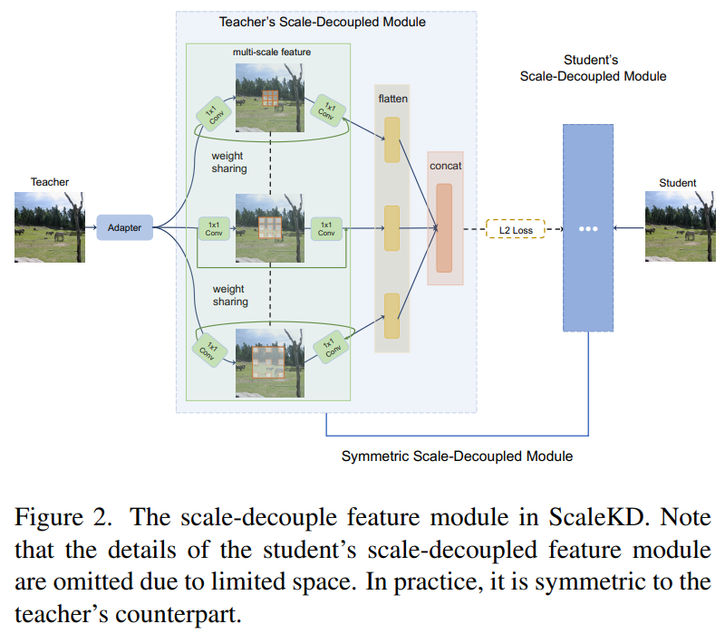 - Teacher와 student 간의 feature dimensionality를 일치시키기 위해 adapter layer $($i.e., MLP$)$를 scale-decoupled feature module전에 적용함.