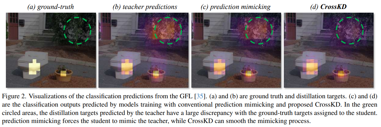 - 기존의 prediction mimicking을 통해 student를 학습할 때는, ground-truth target과 teacher의 prediction을 동시에 모방하게 되는데, student로부터의 ground truth target과 teacher로부터의 distillation target 간의 큰 불일치가 존재함. 이는 그림 2 (a)와 (b)의 초록색 원 비교를 통해서도 확인할 수 있음.
