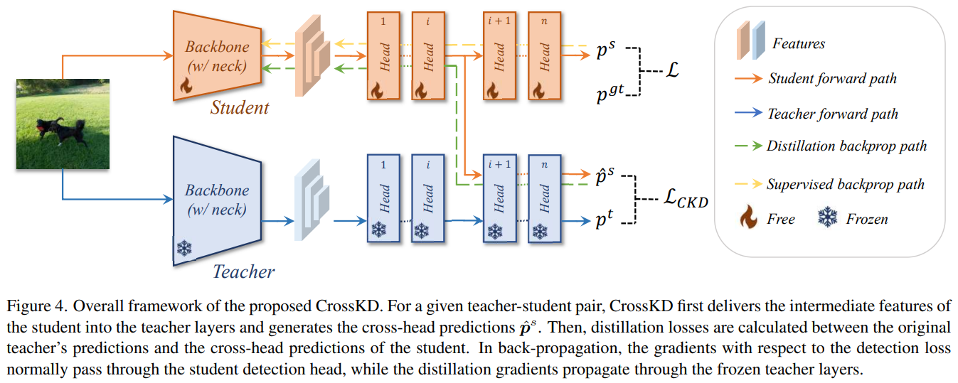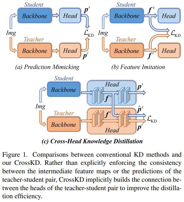 - CrossKD라는 효과적인 prediction mimicking distillation scheme을 제안하여, student의 dtection head의 중간 feature를 teacher의 detection head에 전달함. 이러한 cross-head prediction은 teacher의 prediction을 모방하게 됨.