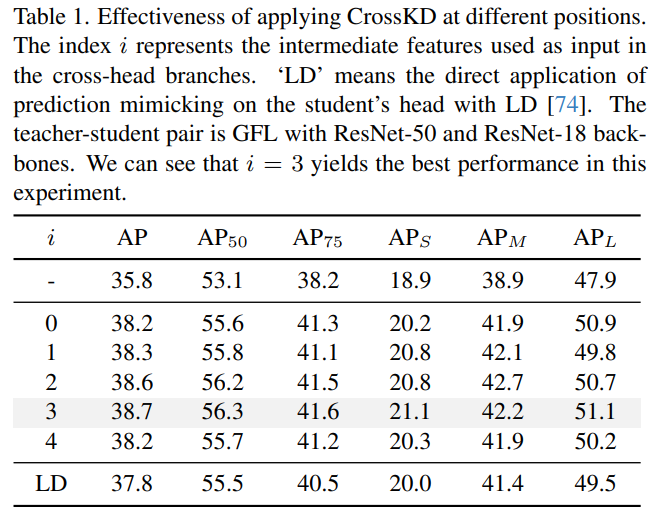 - $i=0$일 때는, student feature가 student의 head를 거치지 않고, 바로 teacher의 head로 들어가기 때문에, 전체 student head가 detection loss에 의해서만 supervised 됨. (student head를 update 할 때 distillation loss의 영향이 없음.)