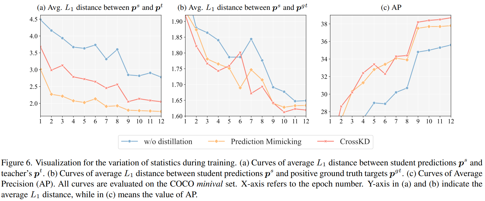 - Prediction mimicking이 distillation loss 계산 시 student prediction을 바로 활용하기 때문에 CrossKD보다 더 작은 $L_{1}$ distance를 기록하지만 (a), ground truth에 대한 $L_{1}$ distance는 CrossKD보다 더 높음 (b). 이는 prediction mimicking 적용 시 target conflict로 인한 contradictory optimization 과정이 수반됨을 보여줌.