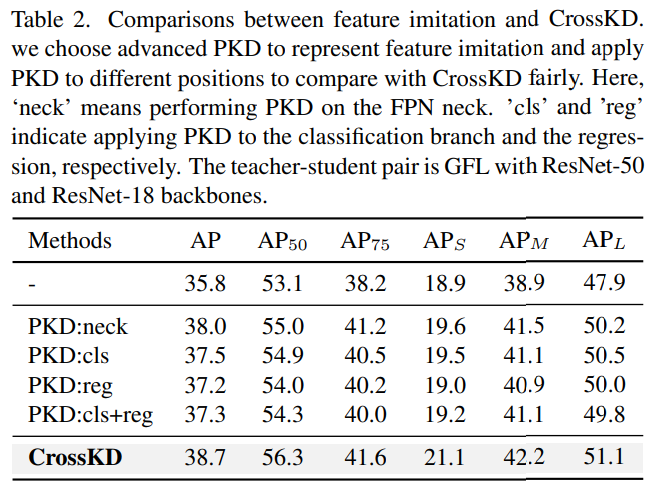 - CrossKD는 더 task-oriented information (classfication and localization)을 제공하는 prediction mimicking의 장점을 그대로 활용함.
