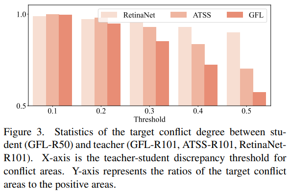 - Target conflict를 측정한 그림 3을 통해, teacher와 student가 같은 label assignment strategy (ATSS & GFL - GFL)를 활용하더라도 ground-truth와 distillation target 간의 불일치가 상당히 존재함을 확인할 수 있고, 다른 assigner의 경우 (RetinaNet - GFL)에는 불일치가 더욱 커짐.