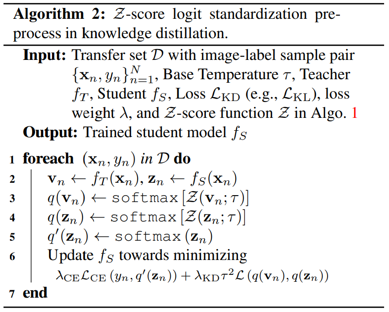 - 이를 활용해, softmax를 적용하기 전, $\mathcal{Z}$-score pre-process를 수행함. 이를 통해 student가 magnitude match가 아닌 핵심적인 logit relation에 집중하도록 함.