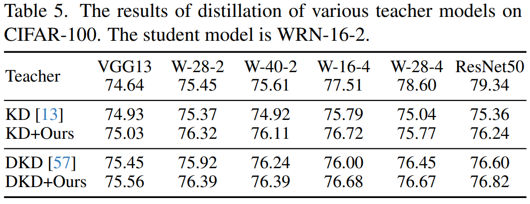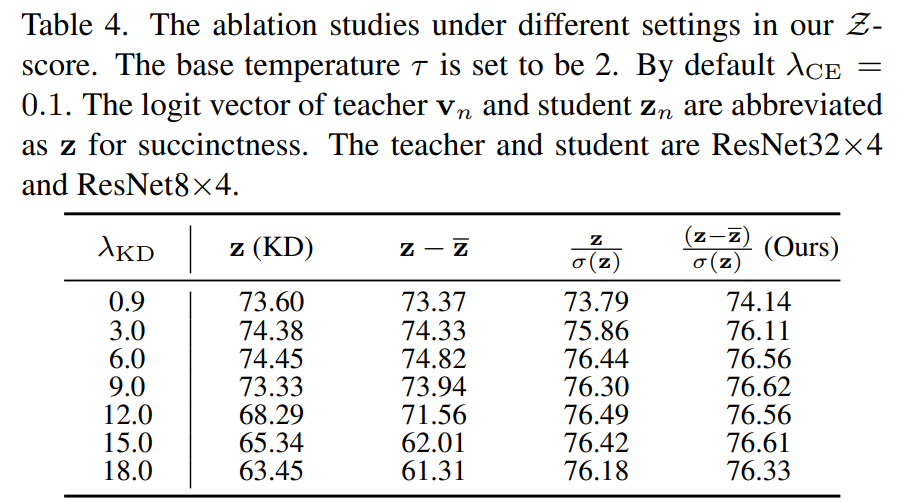 - KD loss의 weight가 증가할수록, vanilla KD의 성능은 급격히 하락하는 것에 반해, $\mathcal{Z}$-score pre-process는 향상된 성능을 얻을 수 있음.