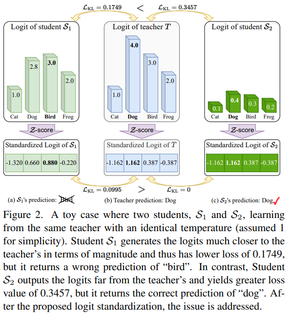 - $\mathcal{Z}$-score를 적용하면, 모든 logit이 re-scaled 되고 magnitude보다 relation이 강조됨. 정규화된 후, loss는 $\mathcal{S}_2$가 $\mathcal{S}_1$보다 낮아지는 것을 확인할 수 있음.