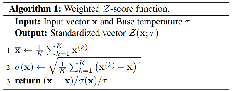 - 기존 shared temperature가 가지는 logit shift, variance match의 두 가지 단점을 극복하기 위해, $a_S, b_S, a_T, b_T$를 각 logit의 mean $\overline{\mathbf{z}}_n$과 weighted standard deviation $\sigma(\mathbf{z}_n)$으로 대체하여 Algo. 1과 같이 weighted $\mathcal{Z}$-score function을 구할 수 있음.