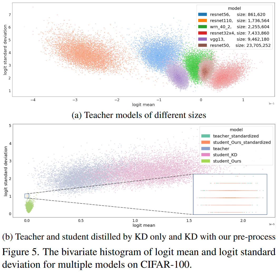 - 본 논문에서는 이를 student가 teacher와 동일한 logit range와 variance를 모사하기 어렵기 때문이라고 해석하고 이를 시각적으로 확인하고자 그림 5를 얻음.