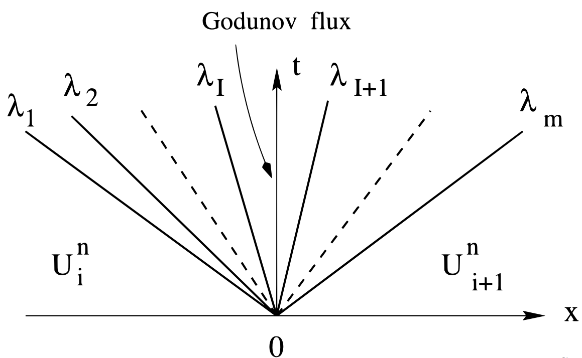 - Godunov flux는 $x/t=0$에서의 solution이 필요함. $x/t=0$의 위치는 $\lambda_I \le 0$과 $\lambda_{I+1} \ge 0$ 사이이기 때문에 다음과 같이 solution $\mathbf{U}_{i+1/2}(0)$을 얻을 수 있음. $$ \mathbf{U}_{i+1/2}(0) = \mathbf{U}^{n}_i + \sum^I_{j=1} (\beta_j - \alpha_j)\mathbf{K}^{(j)} $$