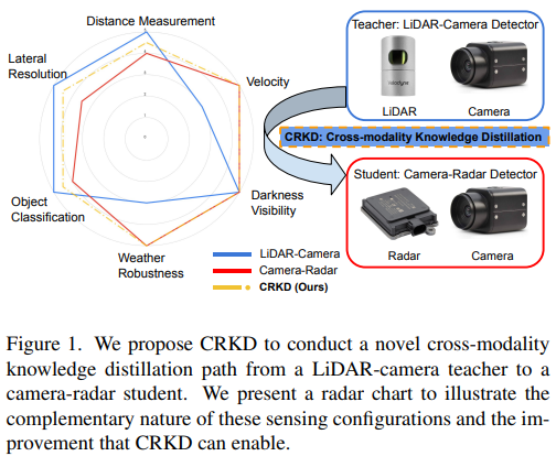 - 따라서, 그림 1에서 보는 것처럼, 본 논문은 CRKD: Camera-Radar 3D object detector with cross-modality Knowledge Distillation을 제안하여, LC teacher detector로부터 CR student detector로 지식을 전달함.