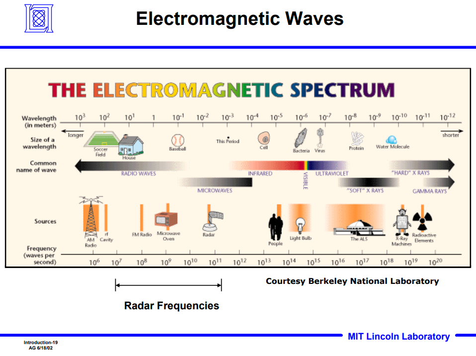 - 레이더 신호는 electromagnetic waves의 일부임. 따라서, electromagnetic spectrum를 살펴볼 필요가 있음.