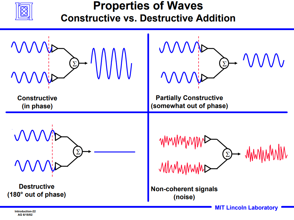 - Non-coherent signals: 서로 phase가 맞지 않기 때문에 완전히 정렬되지 않음. 완전한 phase 일치를 통한 constructive보다는 제한적인 강화 효과만 발생함. 즉, 완전히 coherent 신호에서 얻을 수 있는 최대 강화 효과를 얻지 못함.