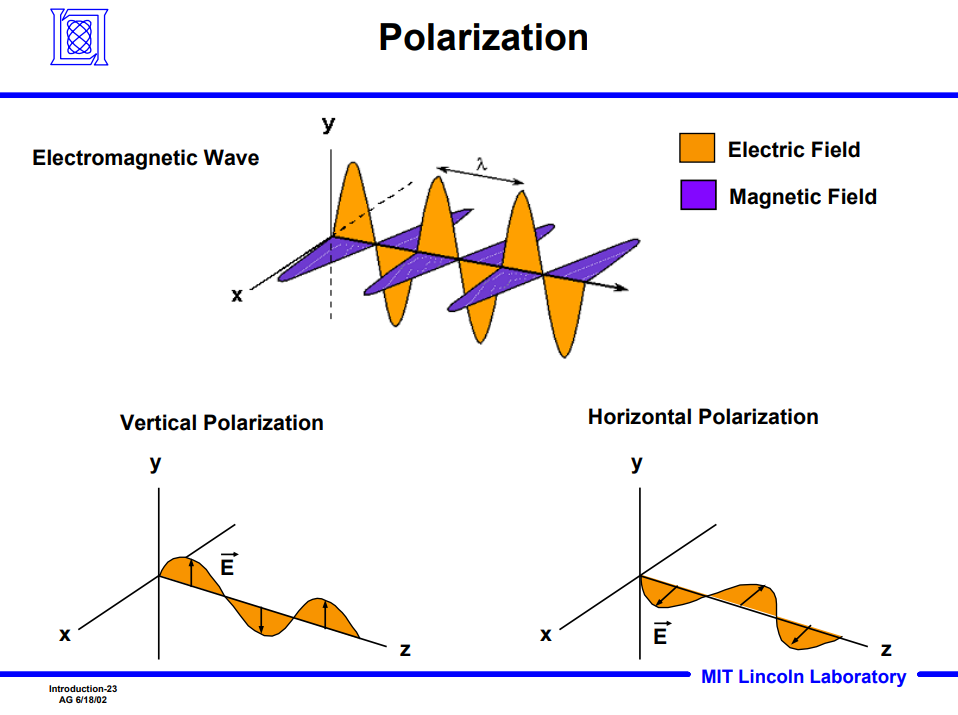 - Electric field가 위아래로 움직이는 경우 vertical polariation이라고 하며, electric field가 좌우로 움직이는 경우 horizontal polarization이라고 함.