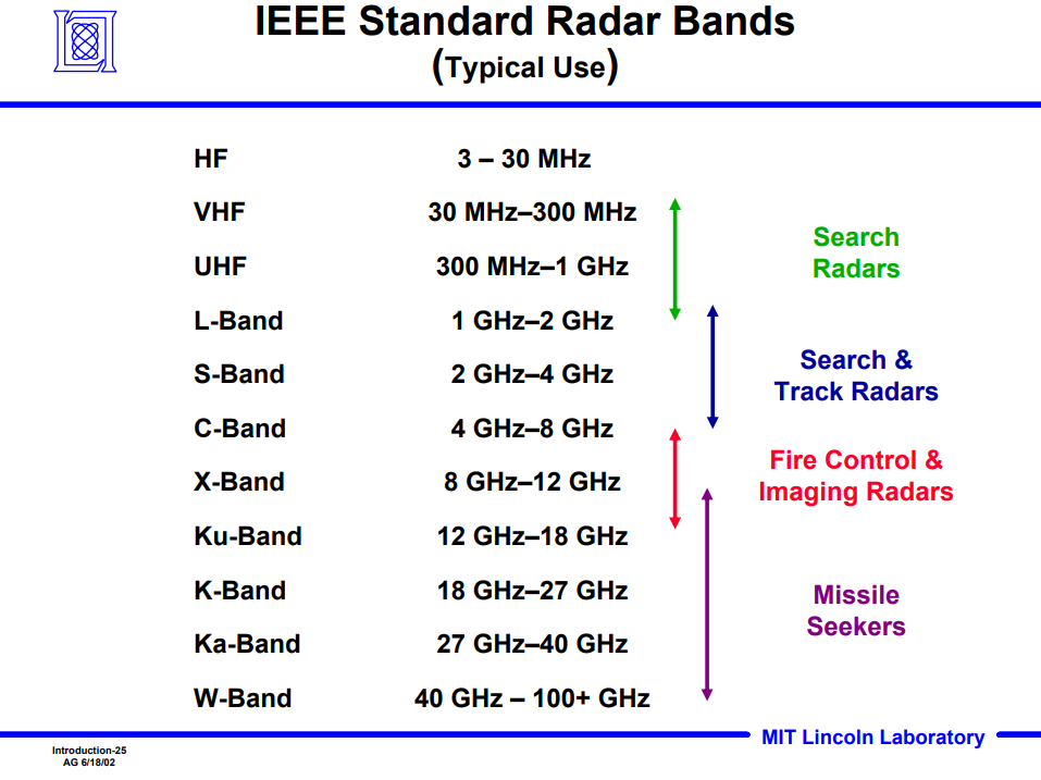 - 대표적인 radar 주파수 대역과 그에 대응하는 주파수, 용도를 구분할 수 있음.