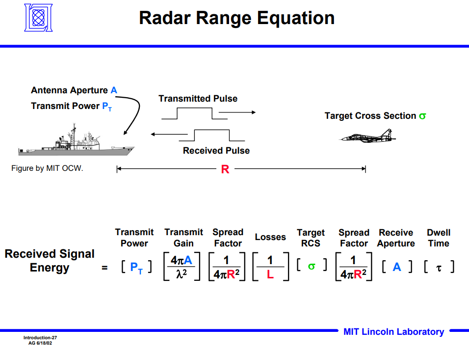 - Radar가 목표물을 탐지할 수 있는 능력은 Antenna Aperture (즉, Diameter)와 Transmit Power로 결정되는 데, Antenna Aperture가 크고, Transmit Power가 높을수록 목표물을 탐지하기 쉬워짐.