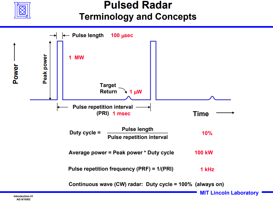 - Continuous Wave (CW) Radar의 경우 항상 켜져 있기 때문에 Duty Cycle이 100%임.