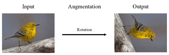 - Rotation: 이미지를 0도에서 360도 사이의 특정 각도로 회전시킴. 회전 각도는 Hyperparameter이기 때문에 데이터셋의 특성에 따라 적절하게 결정해야 함.