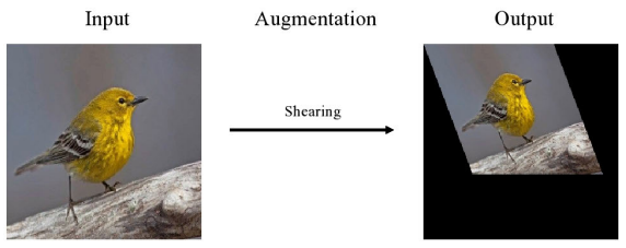 - Shearing: 이미지의 한 부분을 특정 방향으로 이동시키고, 다른 부분을 반대 방향으로 이동시킴. 과도한 Shearing은 이미지를 심하게 변형시키기 때문에 객체 인식을 어렵게 함