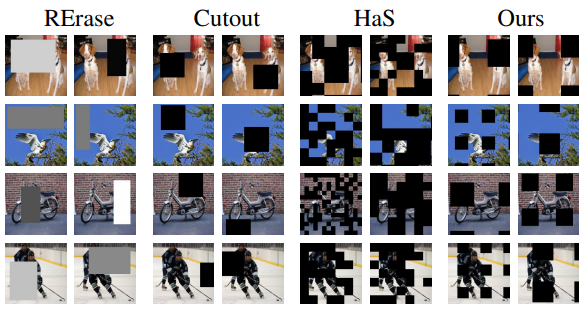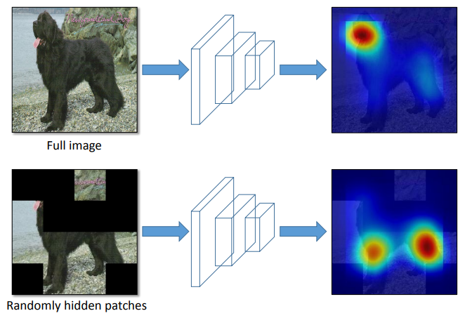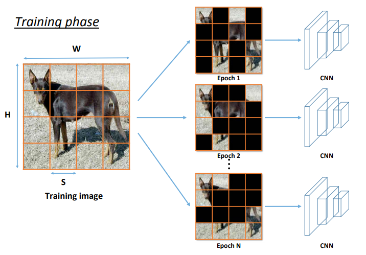 - Hide-and-Seek: 이미지를 균일한 크기의 작은 정사각형으로 나눈 후, 일부를 부작위로 제거하여 매 epoch마다 서로 다른 증강 이미지로 모델을 학습함. 이는 불완전한 정보로부터 물체를 인지하도록 하기 때문에 Occlusion에 강건한 모델을 만들 수 있음.