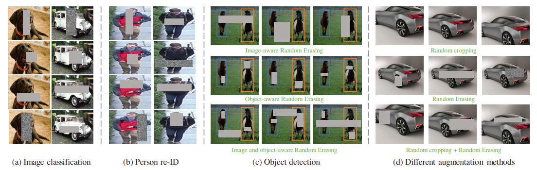 - Random Erasing: 이미지 내 일부 영역을 무작위로 지우는 것은 Cutout과 유사하지만, 지울지 말지와 지울 영역의 Aspect Ratio 및 크기도 무작위로 결정함.