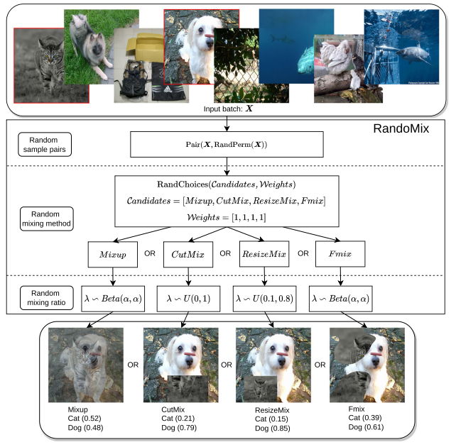 - RandomMix: 여러 Image Mixing 데이터 증강 기법에서 무작위로 선택하여 이미지에 적용하는 방법임. 즉, Mixup, CutMix, ResizeMix, Fmix 등의 기법을 랜덤하게 선택 및 적용함.