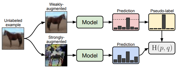 - FixMatch: Unlabeld Data에 대해 약한 증강과 강한 증강을 각각 적용하고, 약한 증강이 적용된 데이터의 예측값이 임계값 이상인 경우 Pseudo Label로 지정함. 그리고, 강한 증강이 적용된 이미지와 크로스엔트로피 Loss를 적용함. 이를 통해 Semi-Supervised Learning의 성능을 향상시킬 수 있음.