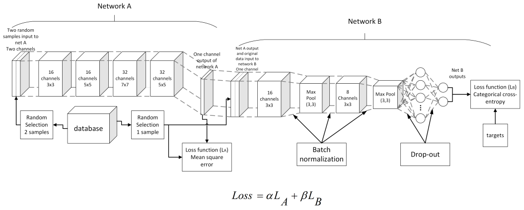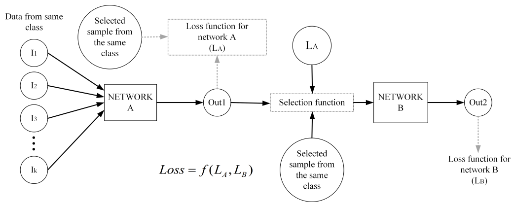 - Network A는 같은 클래스 내의 여러 샘플 (e.g., $\text{I}_1, \text{I}_2, \text{I}_3, \dots, \text{I}_k$)을 입력으로 받아 혼합된 새로운 샘플 (e.g., $\text{Out}_1$)을 생성함. 이때 $\mathcal{L}_A$는 생성한 증강 데이터가 원래 클래스와 유사하도록 학습함.