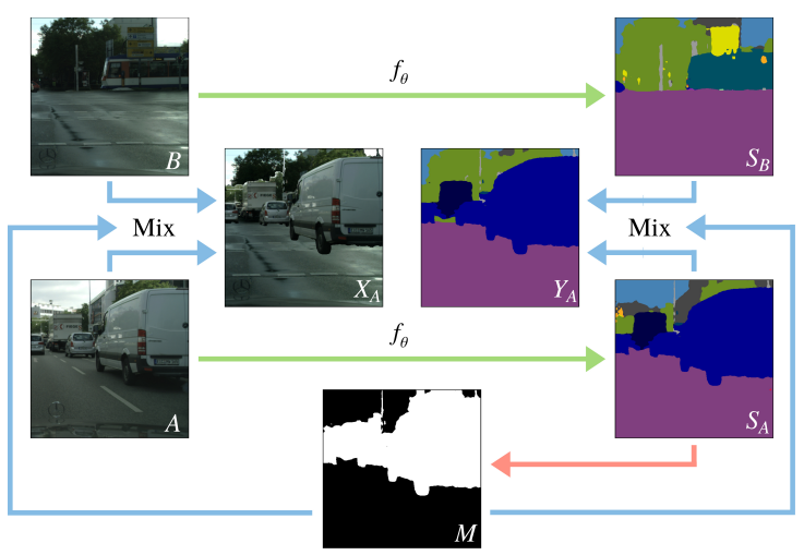 - 두 개의 Label이 없는 이미지 $A$와 $B$를 Network $f_\theta$에 입력하여 Semantic Segmenation을 수행함. 이를 통해, 예측 결과 $S_A$와 $S_B$를 얻음. 이후, $S_A$에서 무작위로 절반의 클래스를 선택하여 Binary Mask $M$을 생성함.