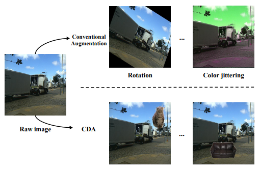 - Context Decoupling Augmentation (CDA): 기존의 데이터 증강 기법들은 동일한 Context를 가진 데이터를 증가시키기 때문에 객체를 구별하는 데 도움이 되지 않음. CDA는 특정 객체의 다양성을 증가시켜 Netowrk가 객체와 Context간의 의존성을 줄이도록 함. 즉, 객체 자체에만 집중하도록 증강을 수행함.