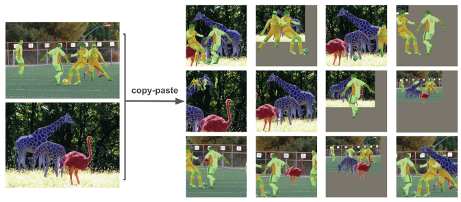 - Simple Copy-Paste: 한 이미지에서 Instance를 복사하여 다른 이미지에 붙여넣어 새로운 이미지를 생성하는 방법으로, Instance를 다양한 Scale로 조정하여 증강할 수 있음.