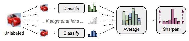 - MixMatch: 하나의 이미지를 $K$번 증강하고, 모든 $K$개의 이미지를 Classifier에 입력함. 이후, $K$개의 Prediction을 평균하고, Average Prediction을 Sharpening하기 위해서 Distribution의 Tmperature를 조절함. 이 방법은 Semi-Supervised Learning에서 유용함.