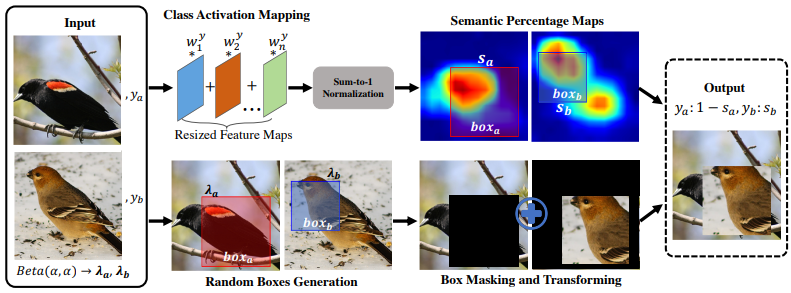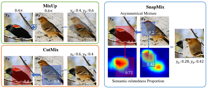 - Semantically Proportional Mixing (SnapMix): Class Activation Map (CAM)을 활용해서 Label Noise를 줄이는 증강 기법임. CAM을 활용하여 Semantically Salient Region을 기준으로 라벨을 혼합함. 즉, 잘린 Patch가 실제로 포함하는 정보의 중요도를 반영하여 라벨을 조정함.