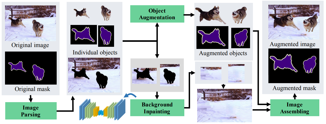 - ObjectAug: 기존의 방법들은 객체와 배경이 결합된 상태에서 증강이 되기 때문에 객체의 경계가 유지되지 않고 왜곡됨. 이를 해결하기 위해, ObjectAug는 Semantic Label을 활용해서 객체와 배경을 분리하고, 객체에 대해서만 증강을 수행함. 이후, 증강된 객체와 배경을 다시 결합하여 새로운 증강 이미지를 생성함.