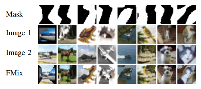 - FMix: Fourier 공간에서 얻을 수 있는 Low-Frequency 이미지에 임계값을 적용하여 Random Binary Masks를 생성할 수 있음. 한 Color Region은 첫 번째 이미지에 적용하고, 또다른 Color Region은 두 번째 이미지에 적용하여 혼합하는 기법임.
