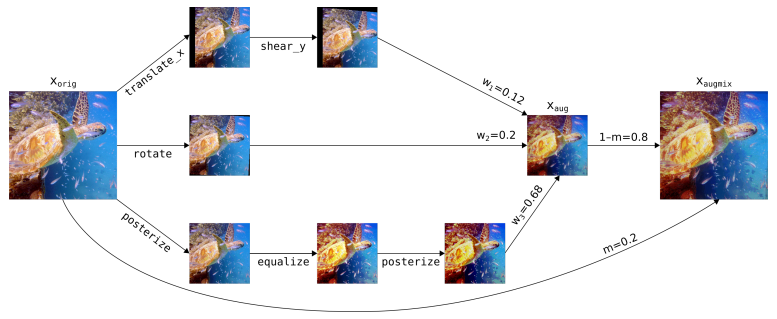 - AugMix: Training Data와 Test Data 간의 분포 차이를 줄이기 위한 데이터 증강 기법임. 입력 이미지에 대해 $M$개의 Random Augmentation을 서로 다른 강도로 적용하고, 결합하여 새로운 이미지를 생성함.