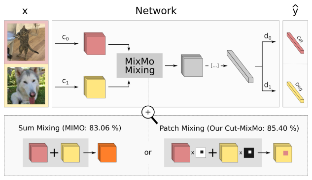 - 기존의 MIMO 방식은 단순히 입력을 더하는 Summing을 사용하지만, MixMo는 CutMix 방식을 활용하여 입력 이미지의 패치를 서로 교환하는 방식 (Mixing Block)을 도입함.