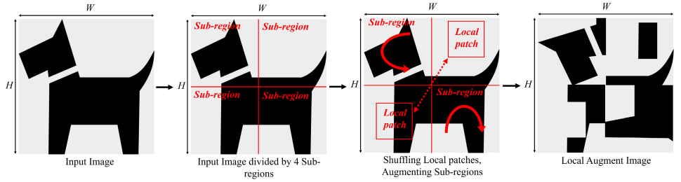 - Local Augment: 이미지를 더 작은 Patch로 나누고 각 Patch에 서로 다른 유형의 데이터 증강을 적용하는 방식으로, 이미지의 개별 Patch를 무작위로 수정하기 때문에, 전체 이미지를 변형하는 Global Augment와는 차별화됨. 이는 이미지의 Global Structure를 보존하진 않지만, Local Feature의 다양성을 증가시킬 수 있음.