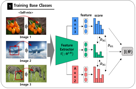 - Self-Augmentation: 이미지의 랜덤 영역을 잘라내어 다시 이미지 내에 임의로 붙이는 방법으로, *Few-shot learning의 일반화 성능을 향상시킴. 이 방식은 Regional Dropout(Self-mix)과 Knowledge Distillation을 결합한 방식임.