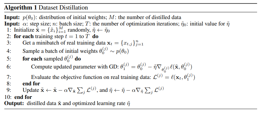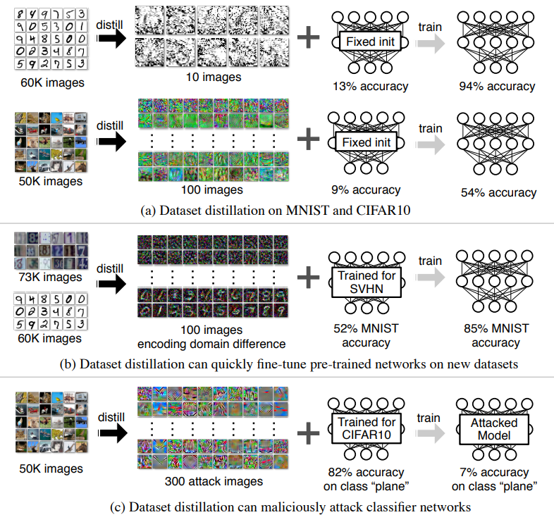 - 전체 학습 데이터의 지식을 소수의 합성 데이터로 압축하는 Dataset Distillation 방법을 최초로 제안