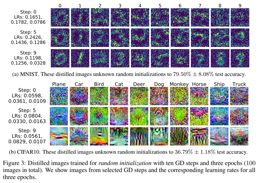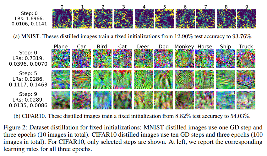 - 이러한 distilled data는 랜덤 노이즈처럼 보이기도 하는데 (Fig. 2), 이는 해당 데이터가 훈련 데이터뿐 아니라 특정 초기 가중치까지 암묵적으로 인코딩하고 있기 때문임.
