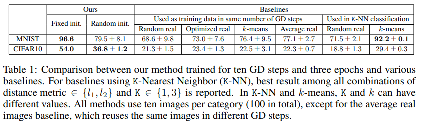 - 제안된 방법은 small distillaed image와 several gradient descent step만으로 높은 분류 성능을 달성할 수 있음.