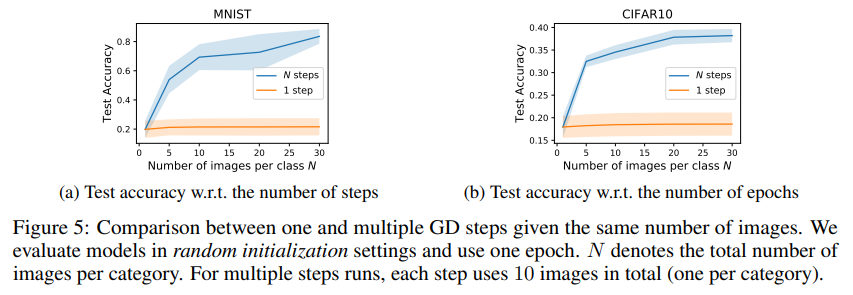 - 더 오래 (more steps), 더 반복 (more epoch) 해서 학습할수록 모델은 distilled image로부터 더 많은 지식을 흡수할 수 있음.