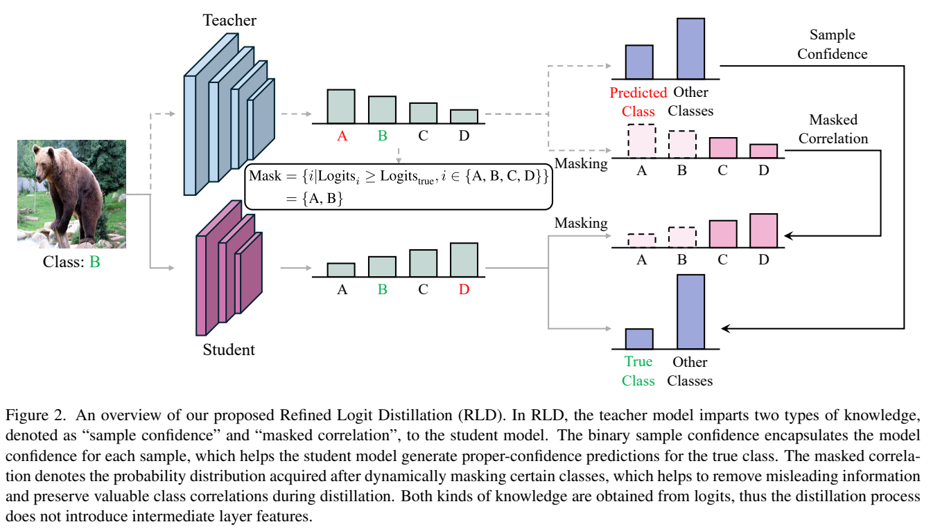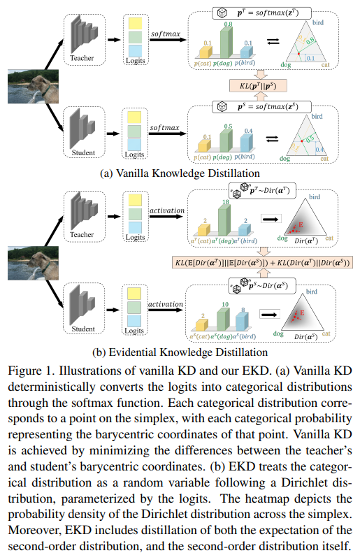 This is a Korean review of"Evidential Knowledge Distillation"presented at ICCV 2025.TL;DR기존의 로짓 기반 지식 증류 방법들은 확률 분포를 singularly deterministic으로 취급하여, 모델 예측에 내재된 본질적인 불확실성을 무시함.확률을 고정된 값이 아닌, second-order Dirichlet 분포에 의해 지배되는 확률 변수로 재정의하여 지식의 표현력을 확장함.macro(2차 분포의 기댓값을 정렬하여 클래스 간의 상대적 비율 관계를 최적화)와 micro(2차 분포 자체를 정렬하여 모델 출력의 수치적 크기를 일치)수준의 지식 전달을 결합한 새로운 증류 기법을 제안함.PAC-Bayesian 이론을 활용하여 EKD의 최적화..